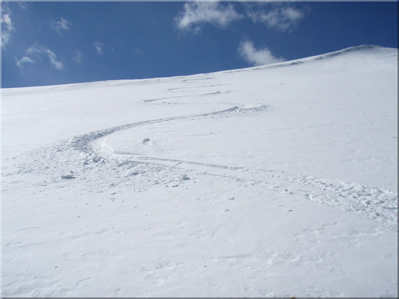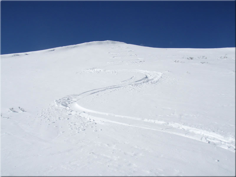 さて私は東北側の斜面に滑降開始です。今回は雪も多いので、斜面の一番ピークあたりから滑ってみましょう。