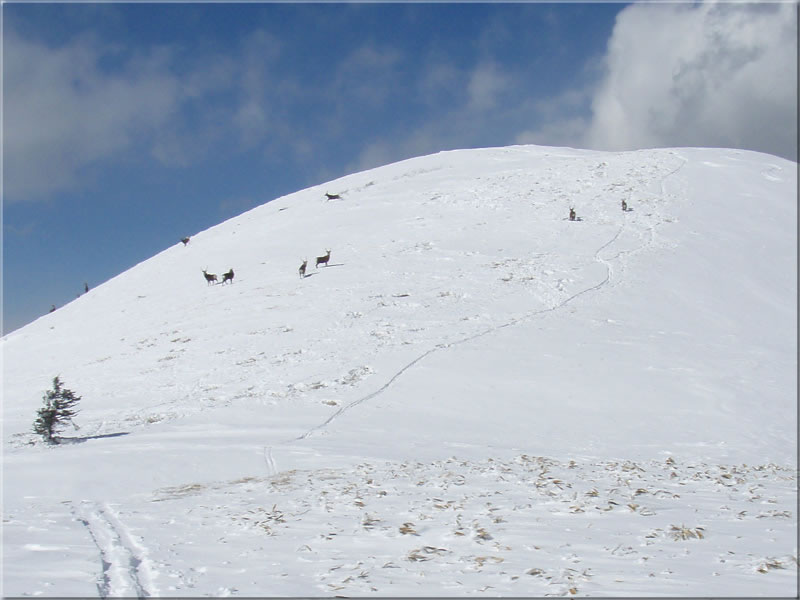 山頂の西側斜面ではたくさんの鹿が雪を掘って何かを食べていました。人の気配で半分ほどが逃げてしまいましたが、全部で15頭ほどはいたと思います。野生でこれほどの群れは初めて見ました。