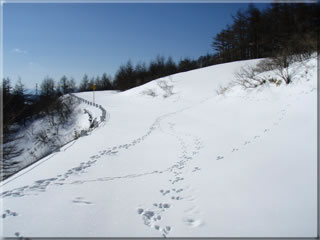 ゲートの横を通って先に進みます。それにしてもこの辺り、見て分かるようにたくさんの筋が付いています。これはもしかするとこの間の週末あたりにたくさんの人が三峰山方面に入った跡なのかもと心配したのですが、上の方は昨日の強風に吹かれてトレースがかき消されたのか、ほぼノートラックと言っても良い状態でした。