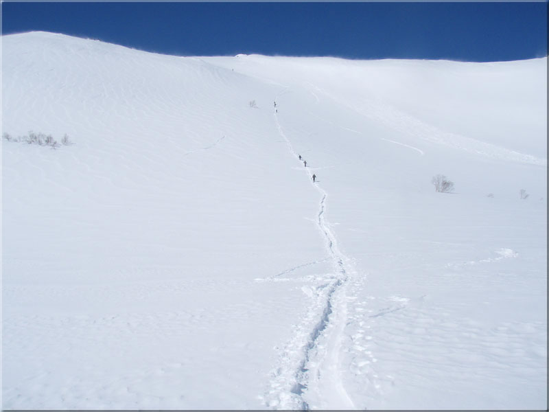 うっすらとシュプールが2つほど見えますが、おそらく昨日あたりのものでしょう。また昨夜見たブログに書かれていた雪崩の跡が登っていくルートの右側に見えています。この斜面はその辺りの上が特に急で、昨年も同じ辺りで雪崩の跡を見ていますし、危険地帯と言って良いでしょう。
