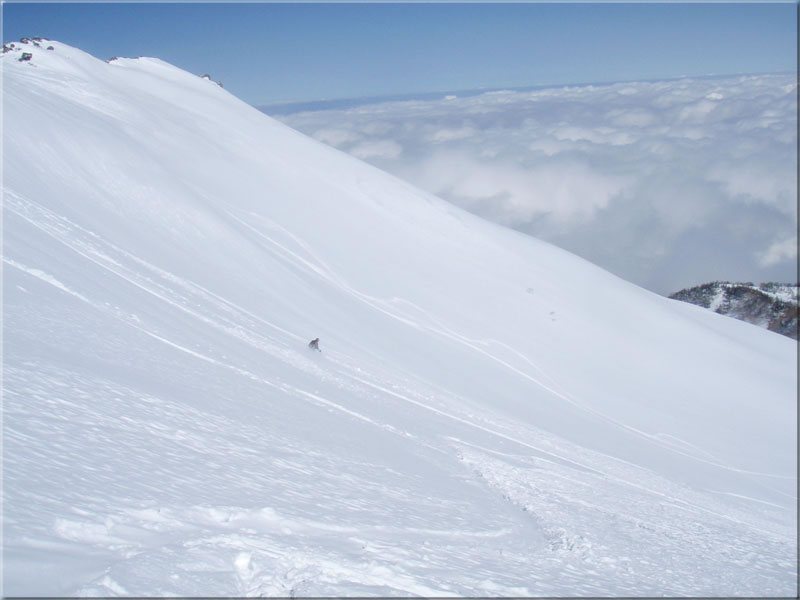ただしばらく進むといきなりさらさらのパウダーの斜面が出てくるようになりました。あれ?どうしたんだろうと思ったのですが、今日はこの辺りに常にガスがかかっていたために日差しがあまり当たっていないせいかもしれません。