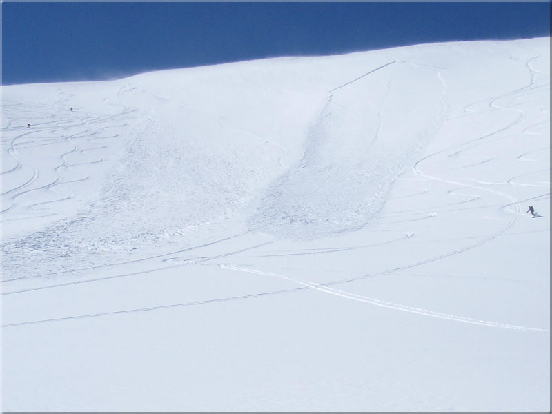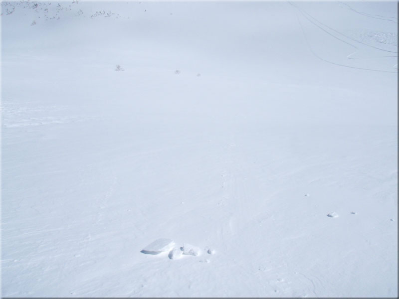 私が滑った斜面も、雪崩れた辺りと比べると多少は緩やかですが、でもこの斜面で一番安全と言えるのはやはり登ったルート辺りと言うことで、やはりむやみにノートラックバーンを求めるのはちょっと危険だなと感じさせられました。(最近ノートラックの新雪を求めて滑ることが多いので)
