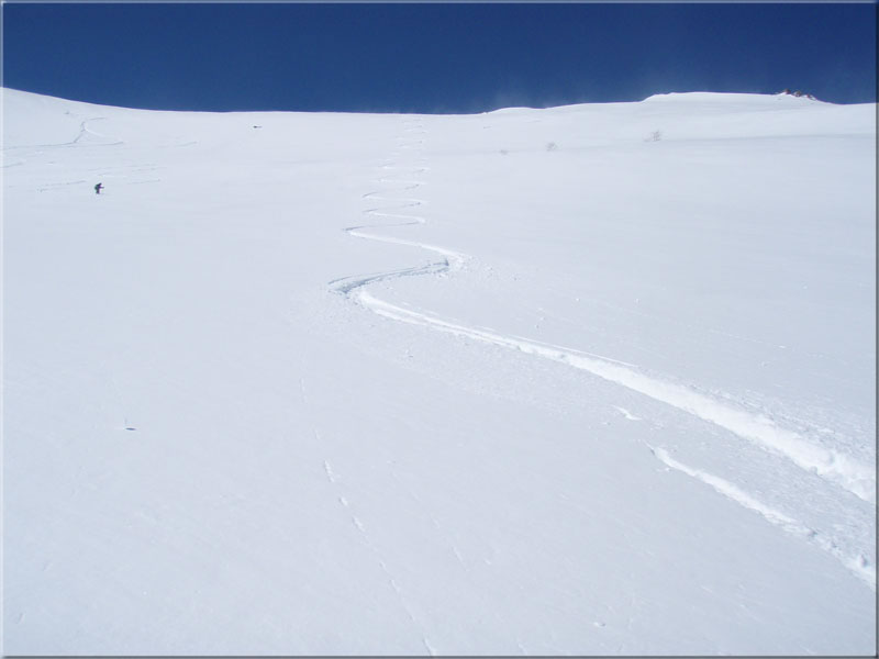 うっ、先ほどの斜面と比べると日差しを良く浴びているせいかちょっと重めのパウダーとなってきていました。