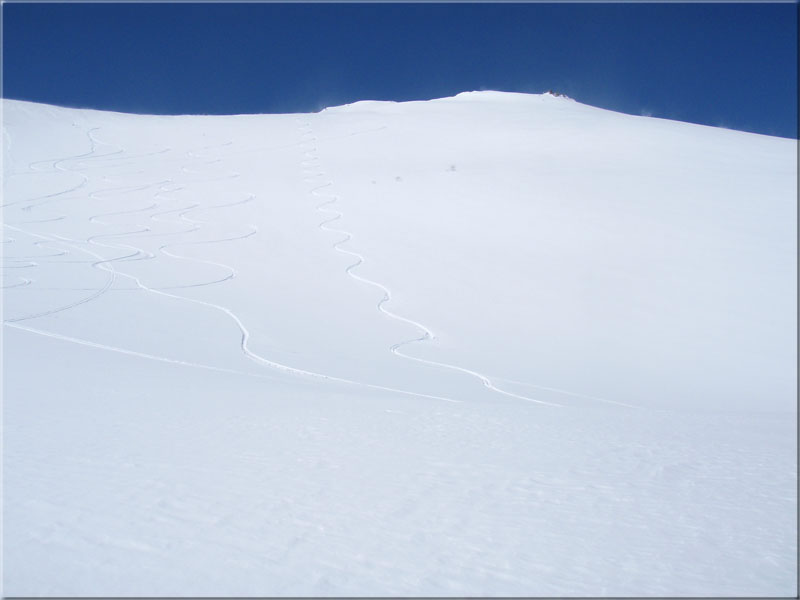 シュカブラででこぼこした堅い斜面をなんとかやり過ごし、雪が柔らかくなったこの辺りからやっとまともに滑ることが出来るようになりました。