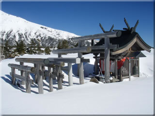 王滝頂上到着、12時46分でした。建物の影で風を避けて遅めのお昼とします。