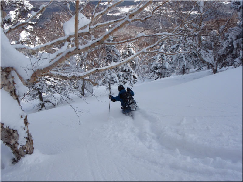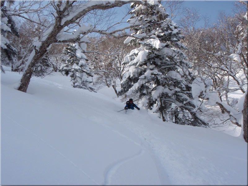 後半はパウダーが膝程度となり、とても滑りやすく感じました。また広葉樹の森ということで日差しが弱く、雪もほとんど重くなっていなくて気持ち良いさらさらパウダーのままでした。