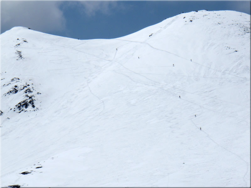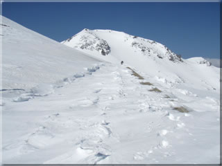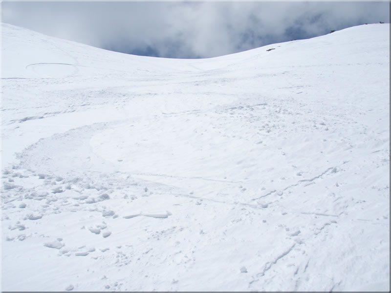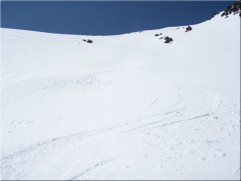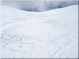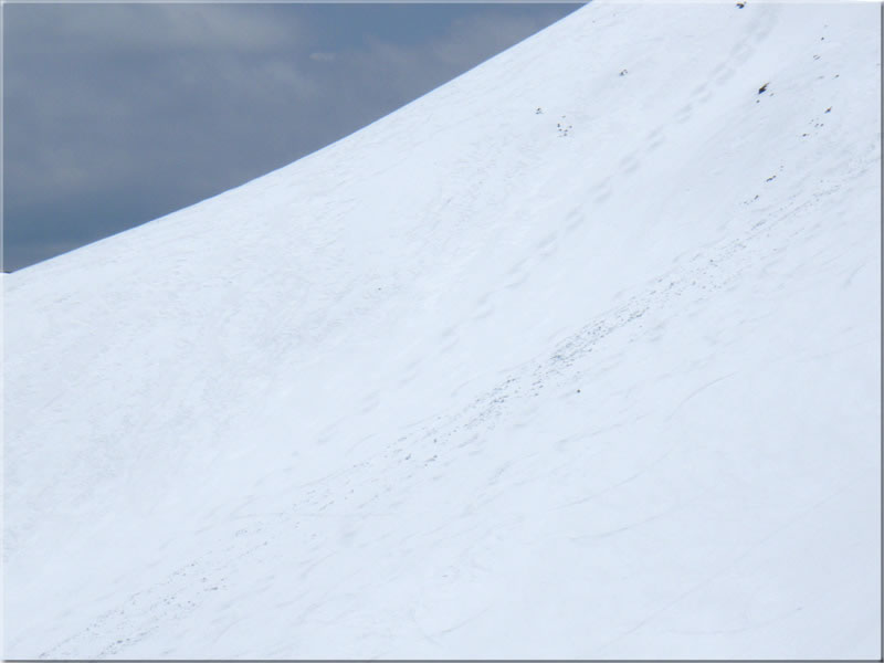 剣ヶ峰直下のルートを滑った私のシュプールがよく見えます(^^)。その手前は雪崩れの跡。