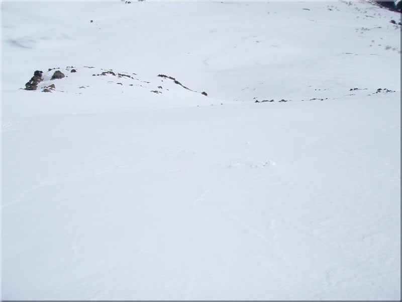 なお肩の小屋の方に直接下る斜面も見てみたのですが、やはり登るときに決めておいた東側の斜面を滑ることにしました。