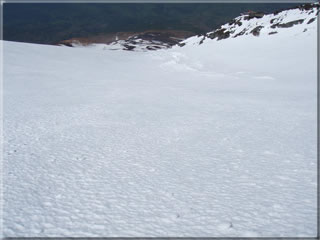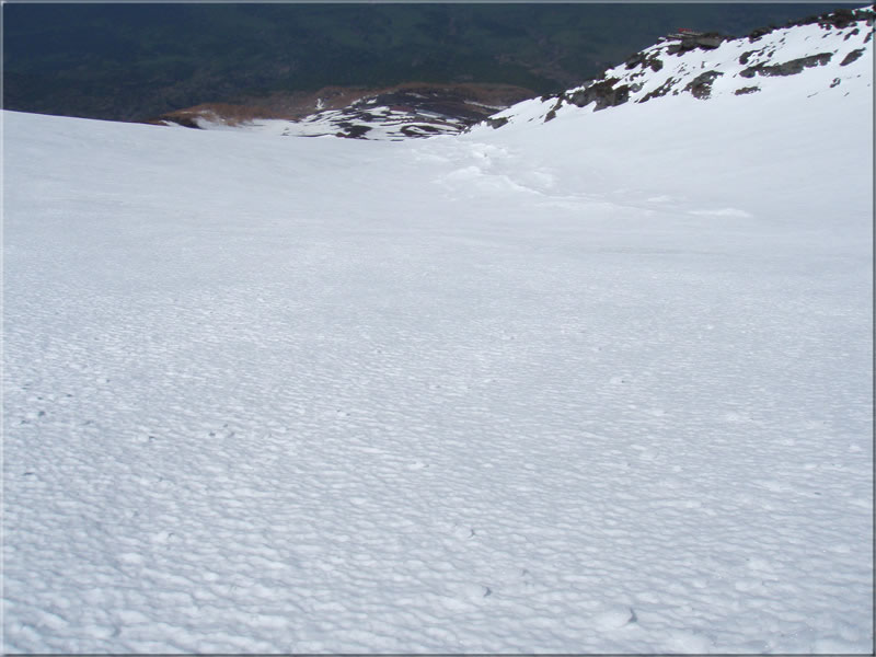 本8合目を過ぎて8合目の小屋群のあたりに来た頃から、ターンの際にところどころ表面の雪が削れる様になり、