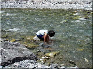 キャンプ地の目の前に流れる三峰川に遊びに行きます。