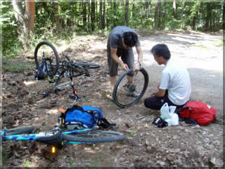 ただこの下りをかっ飛んでいた友人のMTBの後輪タイヤがパンクしてしまい、そこでチューブの交換をしました。