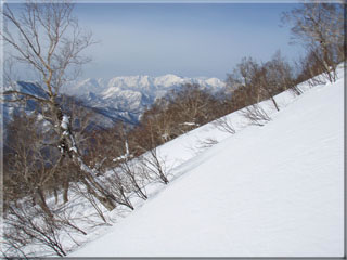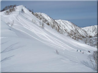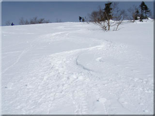 稜線に近づくと、斜面が急に堅くなりました。柔らかいのは表面のせいぜい数cmです。こりゃ上は駄目かなと思ったのですが、実際に滑ってみて、パウダーではないもののそれなりに楽しく滑ることが出来ました。