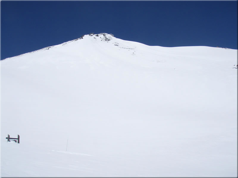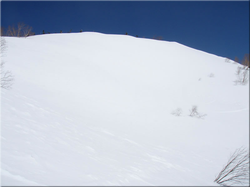 今の斜面を振り返ってみます。稜線からここまで一筋のシュプールが続いているのが分かるでしょうか(^^)。これだからノートラックバーンは止められません(^^;。