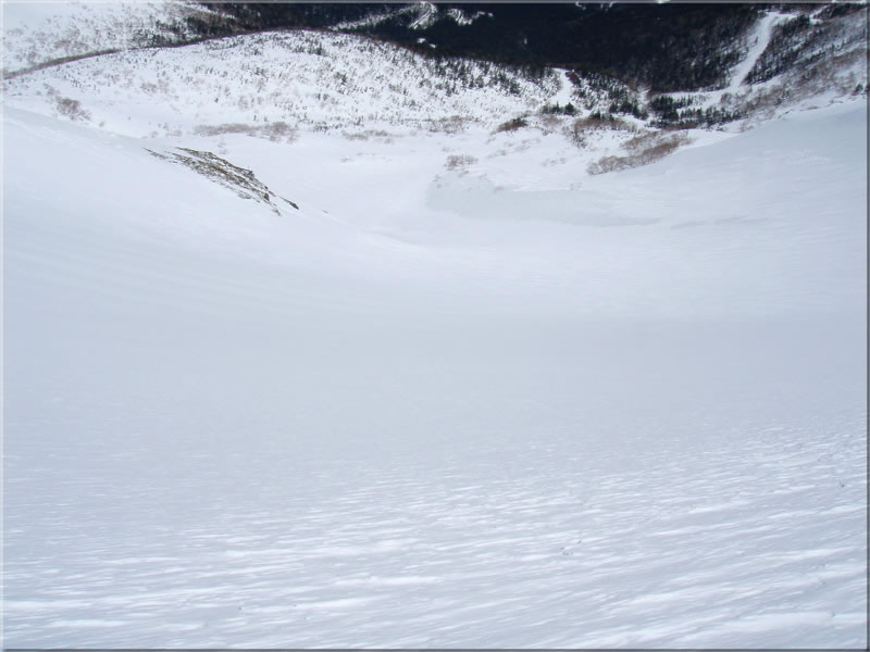 下の方は斜面が少し波打っているように見えます。実際の凹凸はそれほど気にならなかったのですが、その縞の部分で雪質が少し堅めと柔らかめを繰り返しますので、注意しつつ滑っていきます。