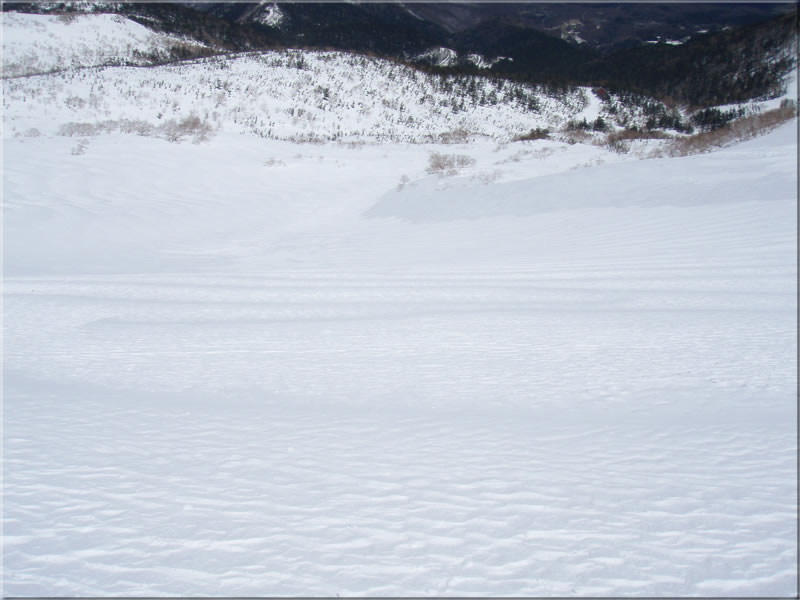 パックパウダーですからこんなものでしょう(^^;。でもスキーで削った雪がパウダーとなって斜面をさーっと流れていきます。