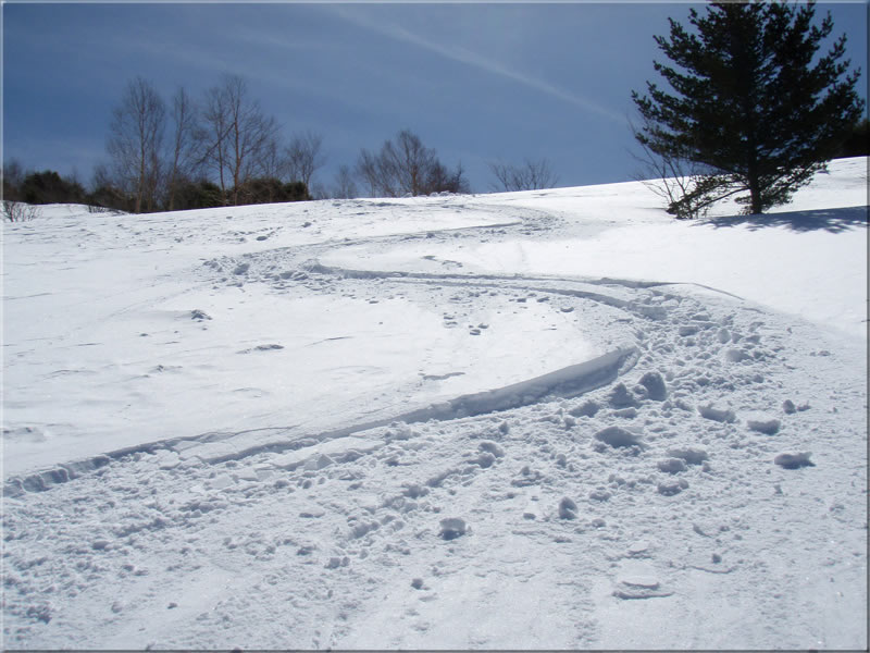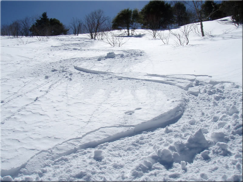一昨日から昨日にかけて山の方は再び雪が降ったということで、再びラストパウダーを期待して湯の丸山に出かけて来ました。今日は気持ち良く晴れ上がり、展望も最高でした。雪ですが、昨日はかなりな強風が吹き荒れたらしく、上の方はかなり飛ばされてしまい、期待していた一面のパウダーという訳にはいきませんでしたが、でもやはり湯の丸山北面は裏切りませんでした(^^)。