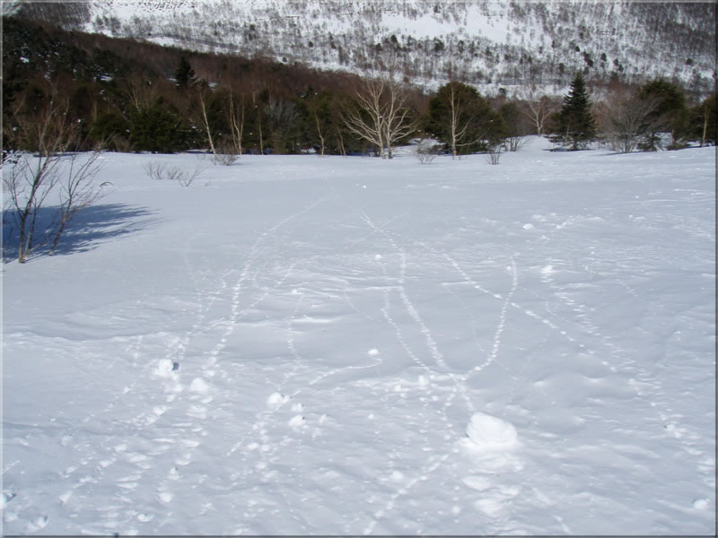 10時25分、ゲレンデから先に進んでいきます。先行者はどうやらスキーが一人、坪足の人が一人という感じでした。昨日の積雪が30cm近くあったようで、坪足の人の足跡は20cmほど沈んでしまっていました。雪もまだそれほど重くなく、これは今日は大いに期待できそうです(^^)。