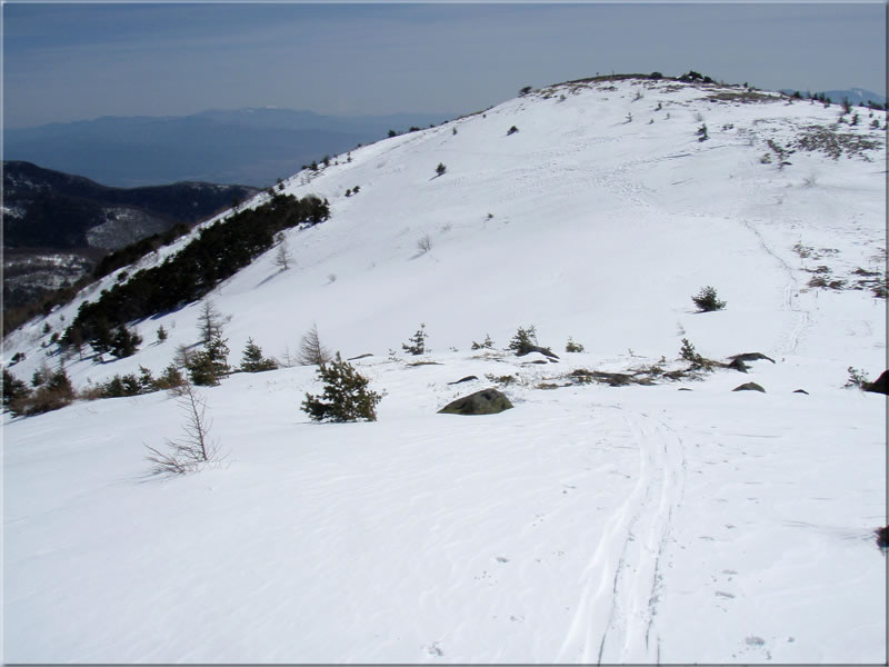 尾根上は昨日の暴風ですっかり雪が飛ばされ、かりかりになっています。