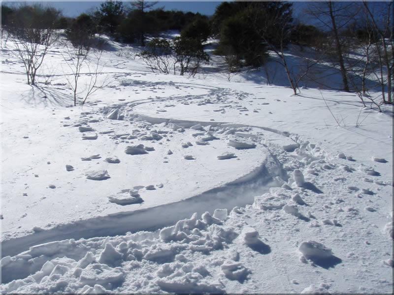 どうやら北の尾根近くの方が新雪が残っているようでしたので、今度は尾根近くの斜面に移動して、ここから滑ってみることにします。