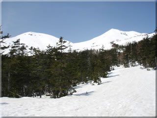現在、春スキーバスは位ヶ原山荘まで運行されているのですが、それに乗るとおそらく大勢の人と一緒に歩くことになりそうと言うことで、それならば少しでも早く登りたいと思い、今回はバスには乗らずに三本滝駐車場からツアーコースを歩いて登ることにしました。ただ...、出発が予定より30分ほど遅くなってしまったことに加え、今日のこの猛烈な暑さで登るペースが上がらず、結局、バスで登った人に先を越されてしまいました(^^;。