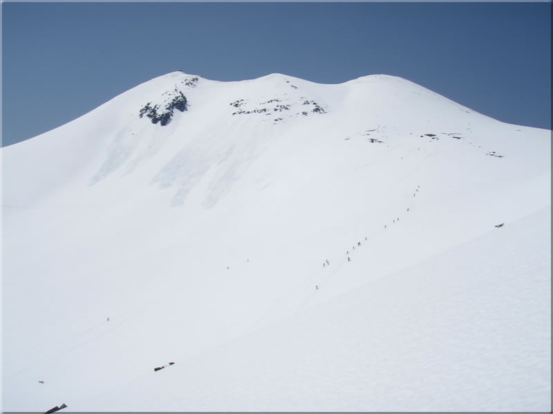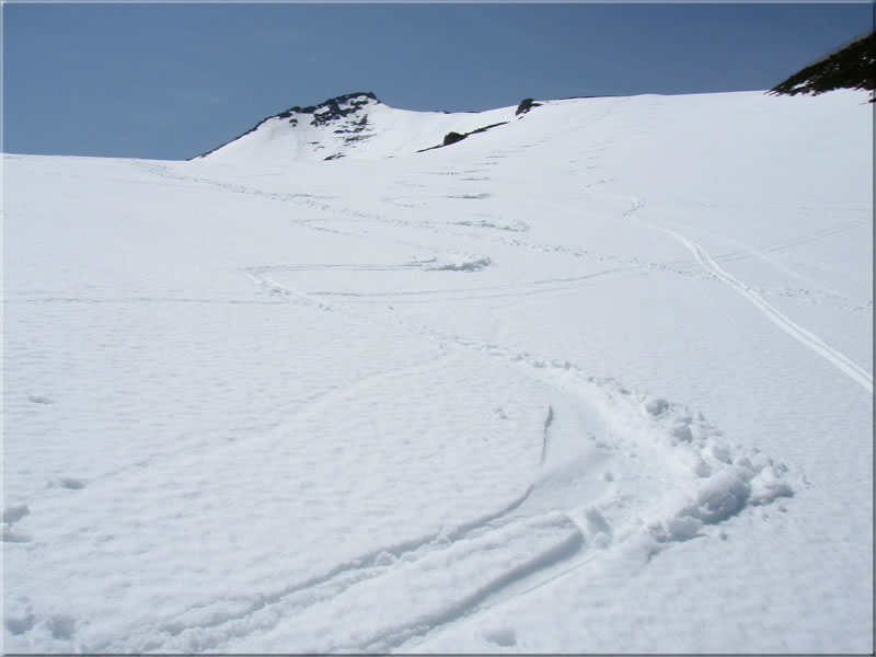 位ヶ原から上は一面新雪に覆われ真っ白です。日射しで暖められてすっかり重くなっていまして、直登でもシールがほとんど滑ることがありませんでした。
