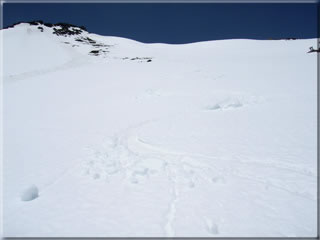 この斜面をそのまま滑るのは止めにして斜面を右へトラバースし、もう少し斜度が緩い部分から再スタートとします。