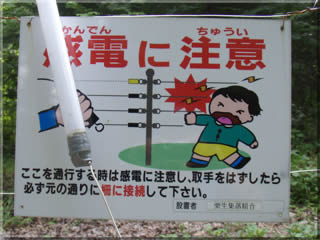 次の写真の部分はちょっと悩みました。道路上に電線が張られていて、周りを見渡しても通過できそうな隙間がありません。あれ?、ルートを間違ったかなと引き返そうになりましたが、右側に掲げられていた注意書きを読んでみたら...