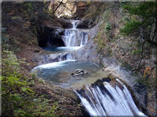 七ツ釜五段の滝。1枚では入りきりませんので、場所を変えて撮影していきます。