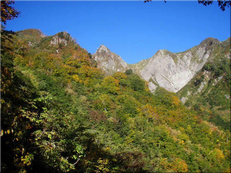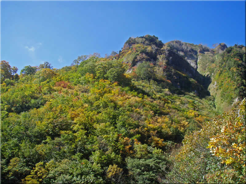 まだ紅葉には早いですが、鎌池の様子をみておこうと鎌池の方に向かいます。次の写真はキャンプ場と鎌池の分岐の辺りから撮影した雨飾山の様子。山頂からもこの場所は見えていました。