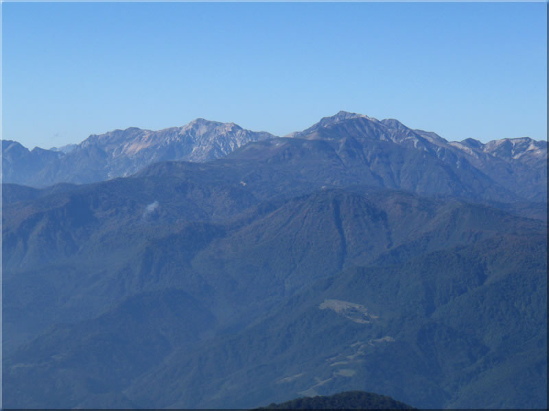 若干薄雲が北側にかかってはいますが、秋晴れの気持ち良い青空が360度広がっています。ではここからの展望をご紹介。南東側の高妻、戸隠方面より右回りで。