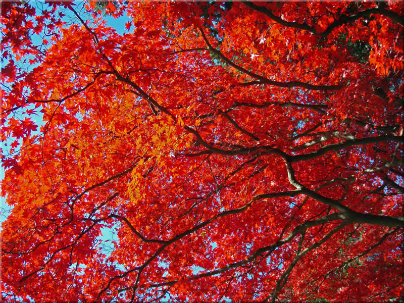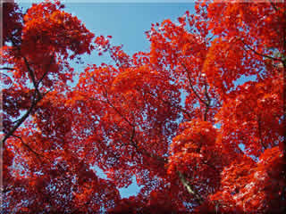 ここのもみじは深紅という表現がぴったりする深い赤が特徴的で、日射しが当たると燃えるような赤に輝きます。