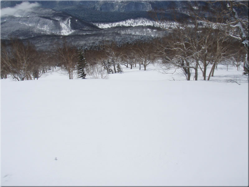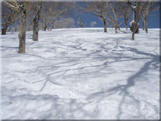 疎林帯の木の陰の部分は20cmほどのさらさらパウダーを楽しむことが出来ました(^^)。ただしその下は堅めのバーンがあって底付きします。