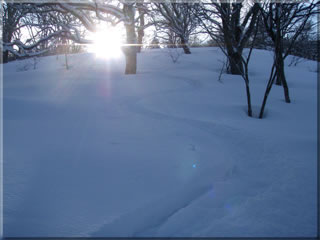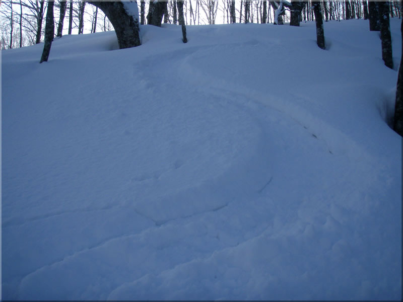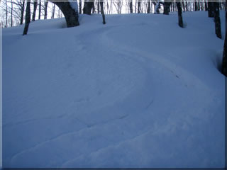 シュプールを見ても分かるとおり、最高でした(^^)。今シーズンに滑ったパウダーの中でも間違いなく極上クラスです。しかも今日はまだこの尾根を下った人はいないようで先行者のシュプールもなく、コース取りは思いのままです。