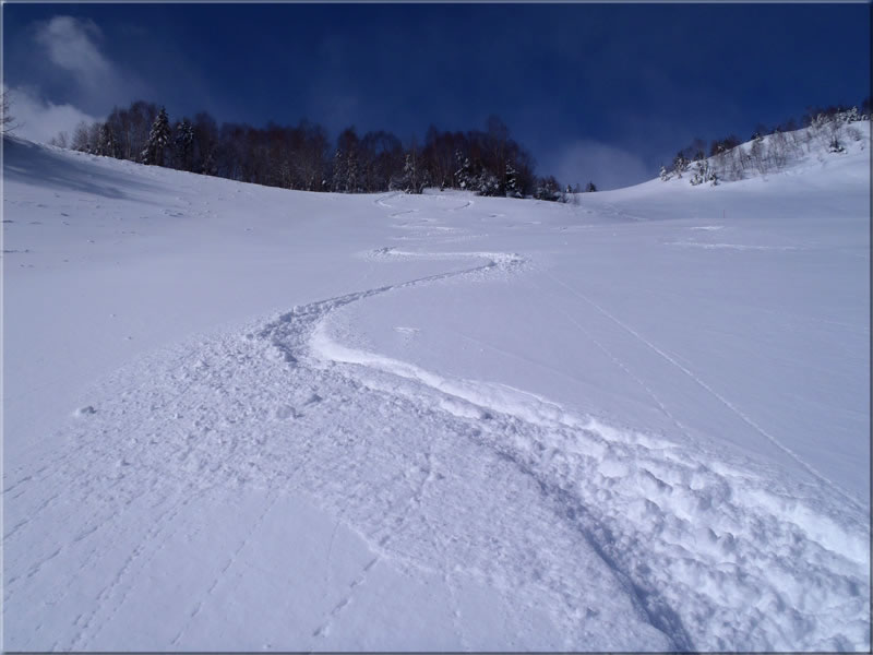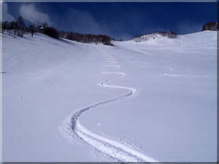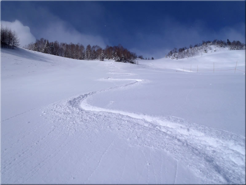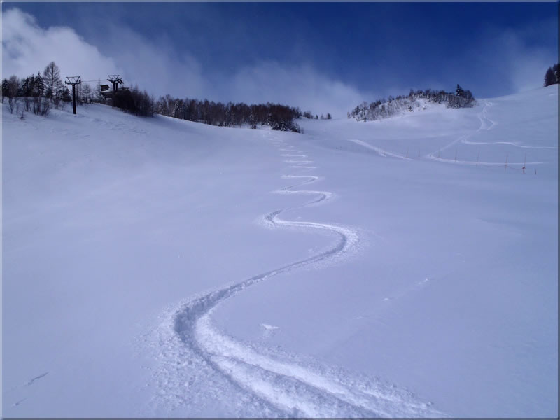 さらさらの新雪は20cmから吹きだまりで30cmほどでしょうか。本当に久しぶりのパウダーの感触です(^^)。スキーの先端からスプレーが舞い上がるのを感じながら滑りました。