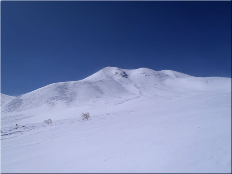 乗鞍岳をズーム。この吹き荒れている強風で雪がかなり飛ばされてしまっているようです。今日は予定通り富士見沢に向かうことにしましょう。