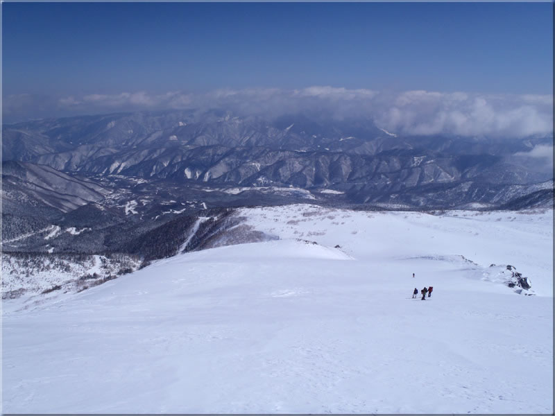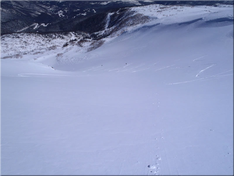 富士見沢上部に向かいます。先行していた3人ですが、最初の一人は富士見岳側の最上部から既に富士見沢を滑り降りて行き、2人は今まさに滑りだそうとしているところでした。私はそのシュプールを避けて、もう少し斜面を左の方にトラバースしていきます。