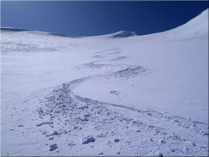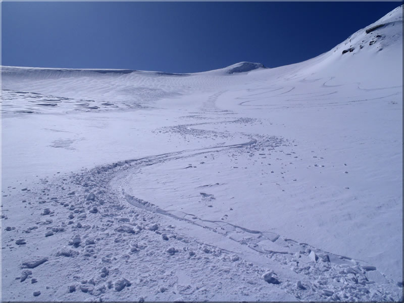 途中で先行者のシュプールを避けて斜面を切り替えます。いったんはもう少し右側までトラバースしたのですが、その斜面はかなり堅くてシュプールが残らないほどでしたので、数ターンで諦めてもう少し中心のこの位置に戻ってきました。