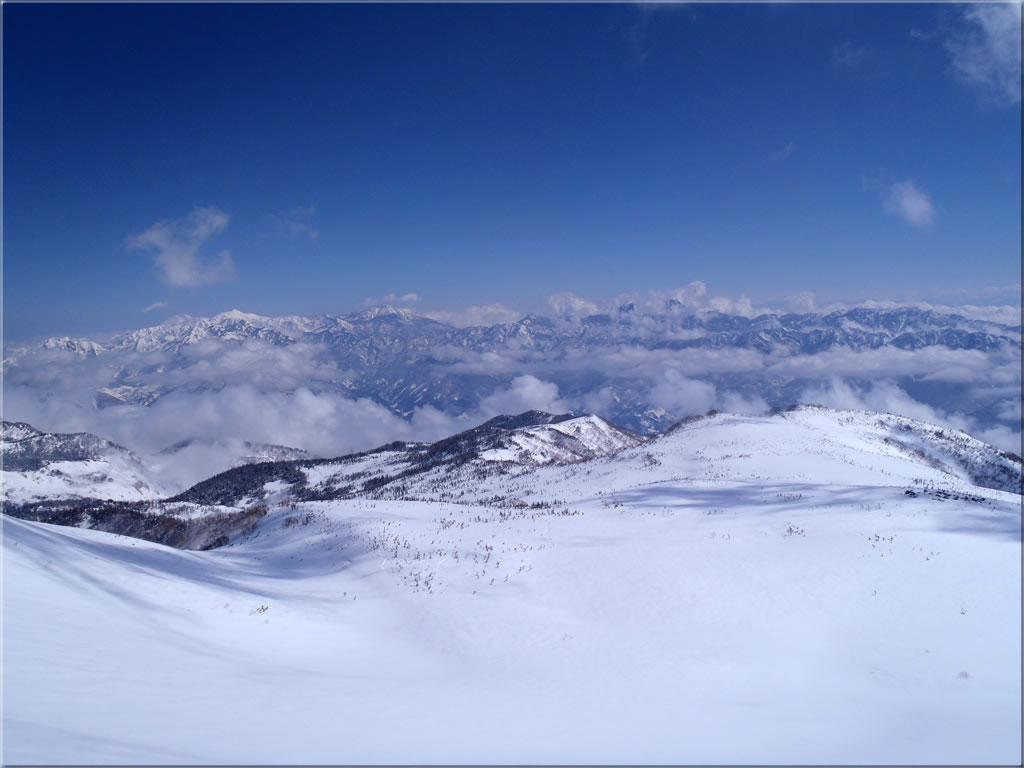 すぐにスノーシューのボーダーの一人が追いついてしばらくラッセルしてくれたものの、すぐに滑っていってしまったため、また先頭になり黙々とラッセルを続けます。雪も強い日射しで徐々に重くなってきて、ペースがあまり上がりません。