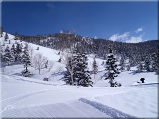 滑る人がまだ少ないので、いたるところノートラックです。しかも雪ももうすっかり重くなっていると思っていたら、意外にもまだパウダーの感触が残っていました。