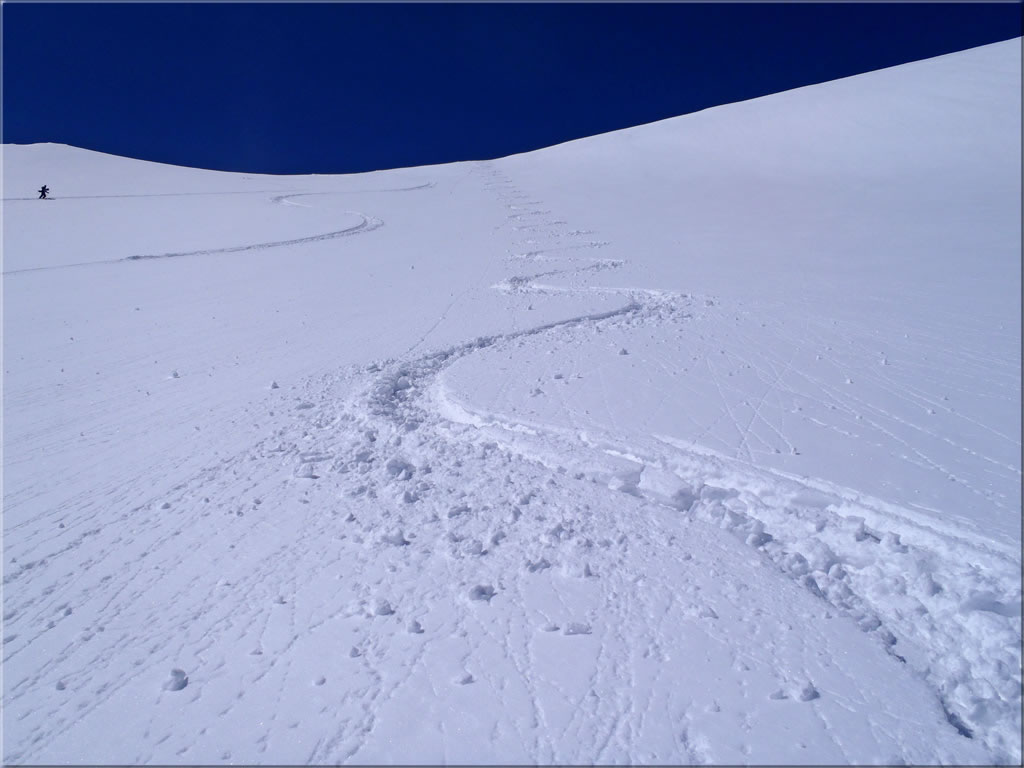 この辺りで先行していた山スキーの人がもう滑り降りて行きました。滑る様子を見ていると、雪もそこそこ安定していそうです。ただ急斜面では固い層で雪が滑る危険性もあると感じ、今回はあまりチャレンジせずにその方の滑降ルートの横をたどるように滑り降りてみました。