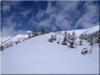 雪ですが、このあたりでは20cmほどのほんとうにさらさらのパウダーが積もっていました。これは今日は大いに期待できそうでわくわくしてきます。ただ同じ方向にこのとき出発したのは私とスノーシューのボーダー二人のみで、私が先頭でラッセルすることになりました(^^;。