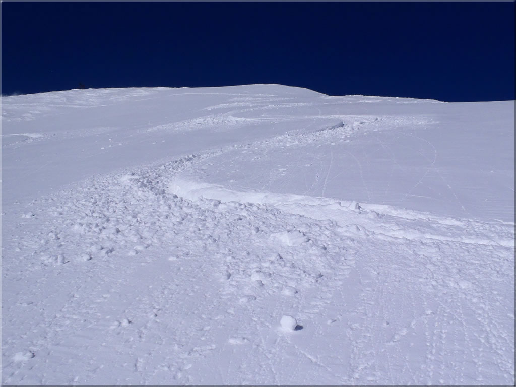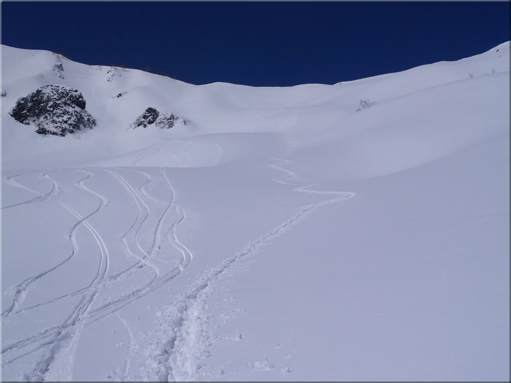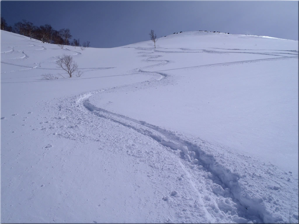 こちら側は風の影響をかなり受けていて、上部は吹きだまりとかりかりの斜面がはっきりとしていました。吹きだまりの斜面を選んで滑り降りていきます。風の影響をあまり受けていないところは気持ち良いクリーミーなパウダーです。