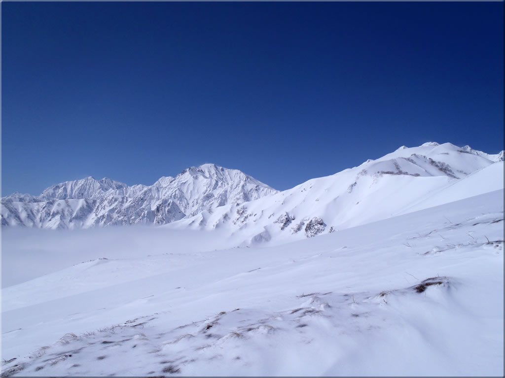 12時32分、やっと尾根上に出ます。そこで休憩していた先行者の皆さんにトレースのお礼を言い、そのまま反対側の八方池の上を通って無名沢上部に向かいます。尾根の最上部は雪が飛ばされてカリカリでしたが、すぐに吹きだまりの雪が出てきます。ではさらさらパウダーを期待して滑降開始!。