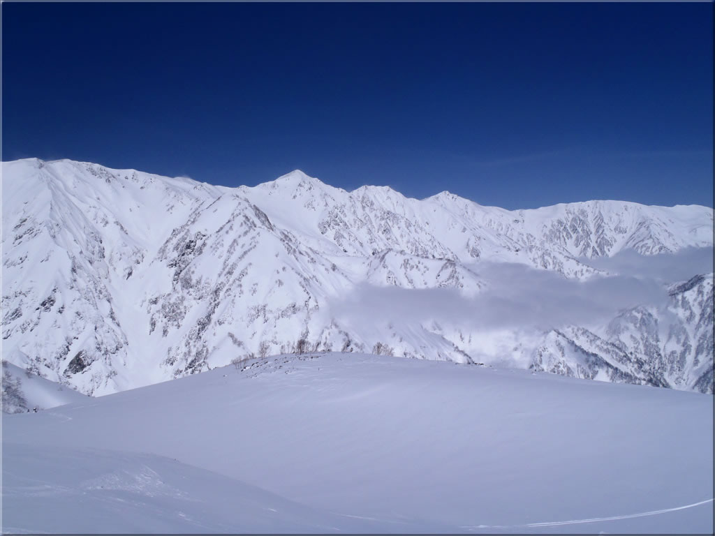 快晴無風でぽかぽかと暖かく、このままのんびりと景色を眺めていたかったですが、ただこの暖かさで時間と共に雪がだんだんと重くなっていきますので、早く滑る斜面を決めて滑ることにします。