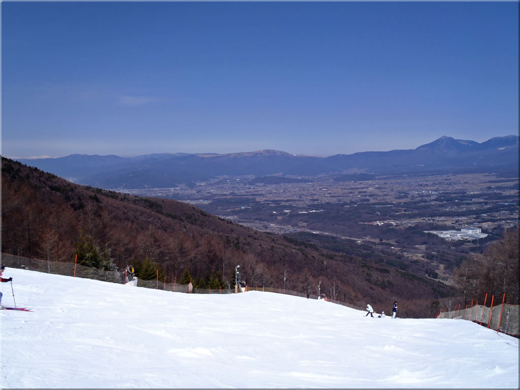 自宅を7時45分に出て富士見パノラマリゾートに向かいます。そして途中で子供達のスキーをレンタルし、8時30分、スキー場の駐車場に到着しました。道路も駐車場にも雪はもうありませんで、見渡す限りゲレンデ以外にも全く雪は見あたりません(^^;。ただゲレンデのコース上にはまだ滑るには十分な雪がありました。