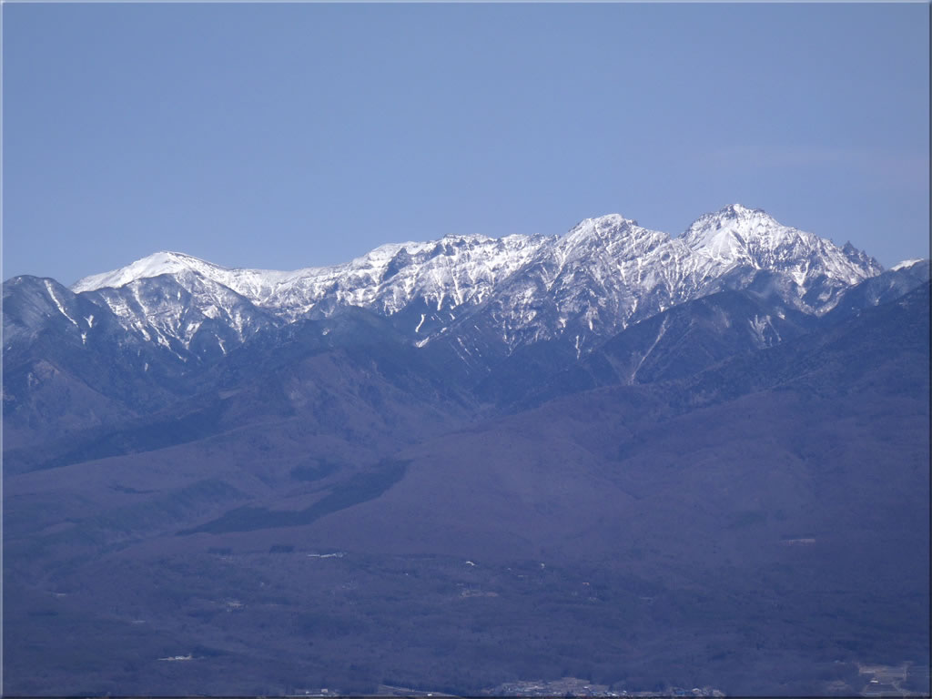 次の写真では左端にわずかに北アルプスの真っ白な山々が見えています。鹿島槍の辺りでしょうか?。