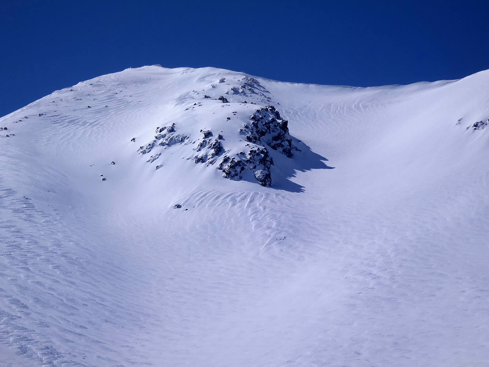 稜線に出ると、さすがに風が少し強くなりました。稜線上では積もった雪が飛ばされてシュカブラが出来ていて、ところどころで下のかりかりのアイスバーンが出ていました。