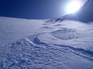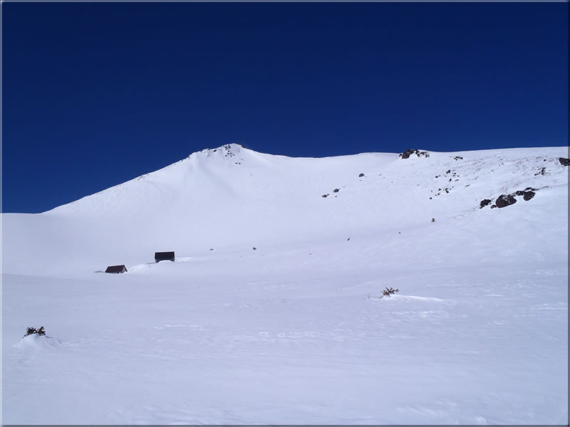 食事後、肩の小屋に向けて登っていきます。正面の斜面はパウダーの20cmほどの吹きだまりとなっていて、滑るには楽しそうな感じでした。