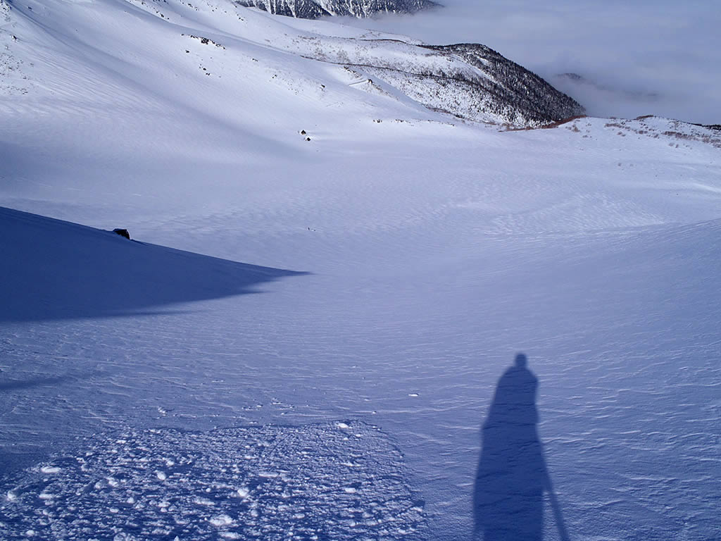 位ヶ原ですが、昨日降ったと思われる重めの新雪が一面に積もっていまして、アイスバーンはほとんど出ていませんでした。乗鞍岳の斜面もいつものテカテカではなく、吹きだまりの新雪が期待できそうです。しかもこの快晴無風で山頂に登るには好条件です。と言うことで、今回は山頂まで登り、剣ヶ峰直下の斜面を滑ってみることにしてみました。