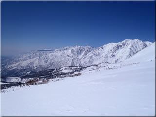 次の写真は帰る途中で撮影した八方尾根スキー場、白馬三山の様子。